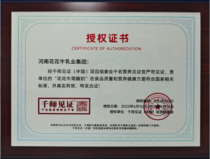 2025年7月2日上午,千師見證(中國)項目組委會項目總策劃、河南食育科學(xué)研究院院長馮梓恒一行蒞臨河南花花牛乳業(yè)集團股份有限公司進(jìn)行交流考察活動,并舉行授牌儀式。河南花花牛乳業(yè)集團黨委委員、副總經(jīng)理王東升及相關(guān)部門負(fù)責(zé)人熱情歡迎。